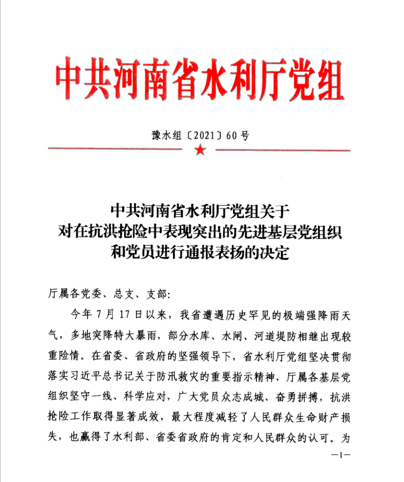 8月9日,省水利廳黨組以豫水組【2021】60號文下發了《關于對在抗洪搶險中表現突出的先進基層黨組織和黨員進行表彰的決定》,公司黨委作為省水利廳抗洪搶險先進基層黨組織,翟淵軍、朱太山、趙廷華、楊華軍、王志軍、陳輝、張明恩、劉蘭勤等8名黨員同志作為省水利廳抗洪搶險先進黨員受到通報表揚。