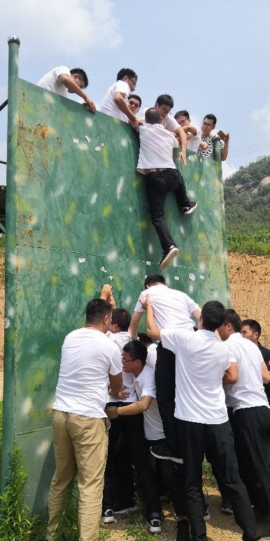 畢業墻:一面4.2米的高墻,不借助任何外界工具,在規定的時間內全體人員完成逃生任務。看似不可能完成的任務,在教練的指導下大家迅速制定戰術,通過搭建起層層人梯,人踩人、人舉人、人拉人的方式奮力拼搏,精誠合作在短短9分鐘完成了任務。當最后一位隊友在大家的努力下成功翻越畢業墻的瞬間,雀躍的歡呼聲久久不散,這是一個看似不可能完成的任務,卻在團隊的共同努力下有如此震撼的結果,團隊的力量,人梯奉獻的力量,給團隊的每一位成員都帶來極大的震撼和自豪,大家忘卻肩膀血痕累累的痛楚,忘卻克服高空經歷的恐懼,記住了被一雙雙手托舉和拉拽的安全感,記住了團隊的強大。