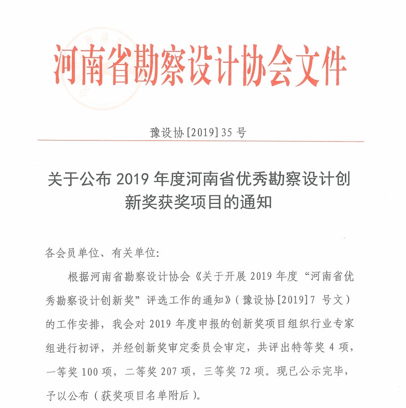 根據河南省勘察設計協會發布的《關于公布2019年度河南省優秀勘察設計創新獎獲獎項目的通知》(豫設協【2019】7號),在2019年度河南省優秀勘察設計創新獎評選活動中,設計公司9項成果獲獎。