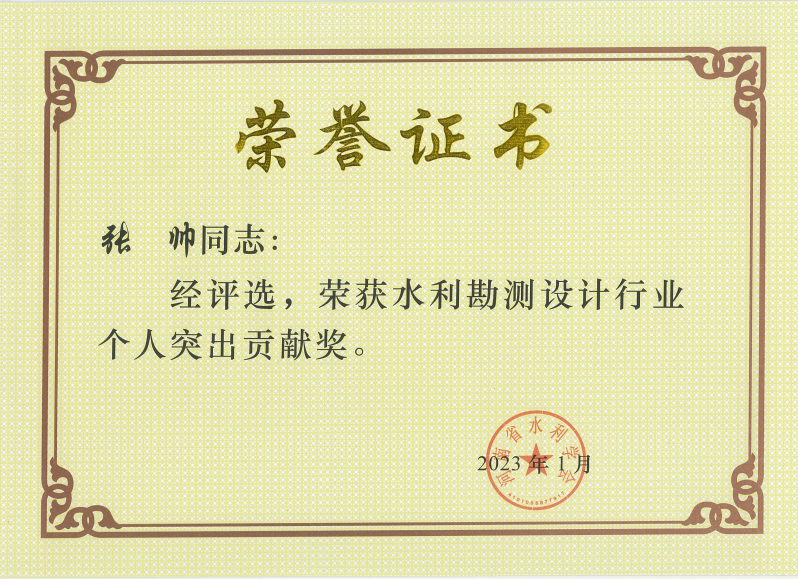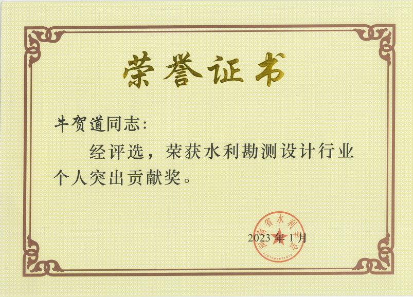 為鼓勵水利科技工作者開拓創(chuàng)新,2022年11月,河南省水利學會在全省開展2022年度個人突出貢獻獎評選活動,19名同志被評為勘測設計類個人突出貢獻獎,公司技術(shù)副總監(jiān)牛賀道和工程設計二院張帥兩位同志獲此殊榮。