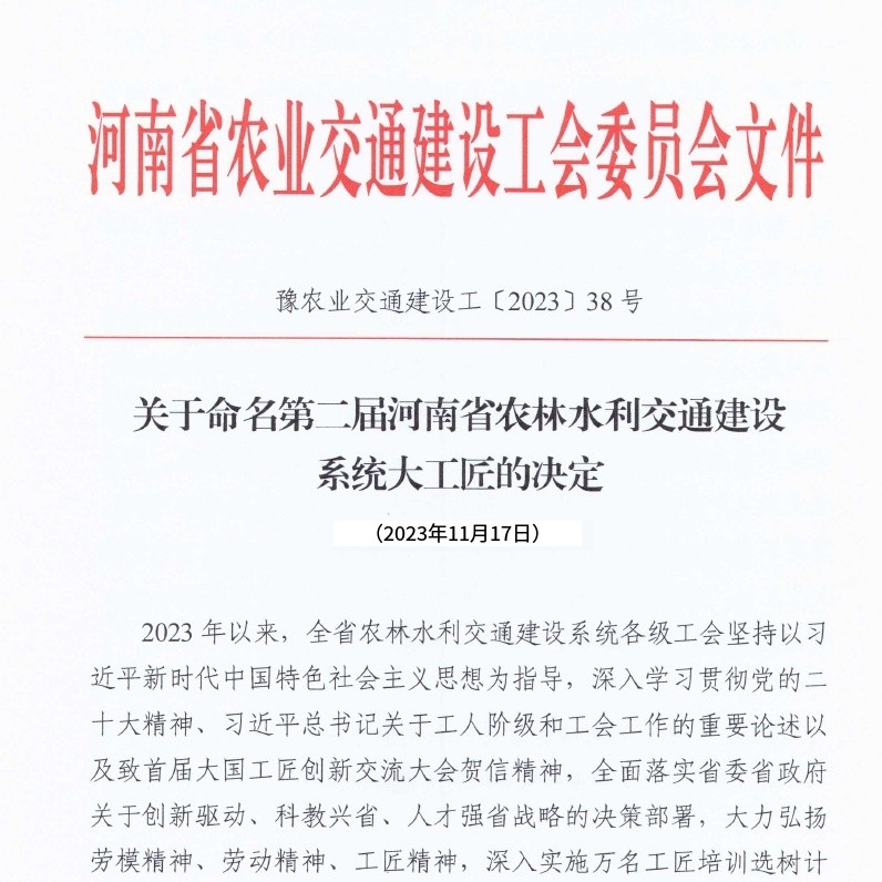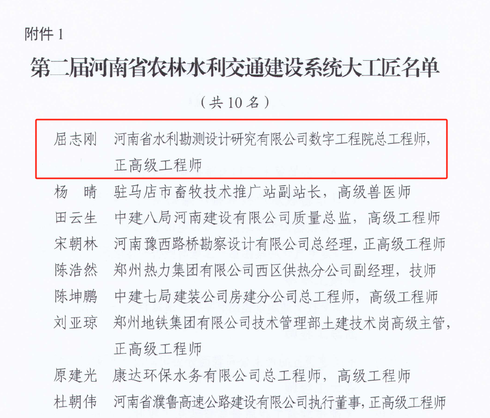 11月17日,河南省農(nóng)業(yè)交通建設(shè)工會(huì)委員發(fā)布命名決定,豫水設(shè)計(jì)公司數(shù)字工程院總工屈志剛同志被命名為第二屆河南省農(nóng)林水利交通建設(shè)系統(tǒng)大工匠,獎(jiǎng)勵(lì)個(gè)人1萬元。本屆評選,由公司申報(bào)、水投集團(tuán)推薦,屈志剛同志從眾多申報(bào)者中脫穎而出,為公司贏得榮譽(yù)。