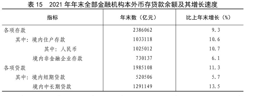 全年社會融資規(guī)模增量31.4萬億元,按可比口徑計算,比上年少3.4萬億元。年末社會融資規(guī)模存量314.1萬億元,按可比口徑計算,比上年末增長10.3%,其中對實體經(jīng)濟發(fā)放的人民幣貸款余額191.5萬億元,增長11.6%。年末全部金融機構(gòu)本外幣各項存款余額238.6萬億元,比年初增加20.2萬億元,其中人民幣各項存款余額232.3萬億元,增加19.7萬億元。全部金融機構(gòu)本外幣各項貸款余額198.5萬億元,增加20.1萬億元,其中人民幣各項貸款余額192.7萬億元,增加19.9萬億元。人民幣普惠金融貸款余額26.5萬億元,增加5.0萬億元。