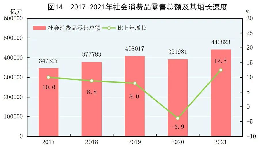 全年社會消費品零售總額440823億元,比上年增長12.5%。按經(jīng)營地統(tǒng)計,城鎮(zhèn)消費品零售額381558億元,增長12.5%;鄉(xiāng)村消費品零售額59265億元,增長12.1%。按消費類型統(tǒng)計,商品零售額393928億元,增長11.8%;餐飲收入額46895億元,增長18.6%。