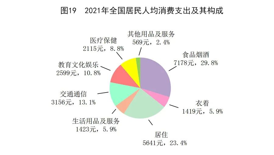 全年全國居民人均消費支出24100元,比上年增長13.6%,扣除價格因素,實際增長12.6%。其中,人均服務性消費支出10645元,比上年增長17.8%,占居民人均消費支出的比重為44.2%。按常住地分,城鎮(zhèn)居民人均消費支出30307元,增長12.2%,扣除價格因素,實際增長11.1%;農(nóng)村居民人均消費支出15916元,增長16.1%,扣除價格因素,實際增長15.3%。全國居民恩格爾系數(shù)為29.8%,其中城鎮(zhèn)為28.6%,農(nóng)村為32.7%。