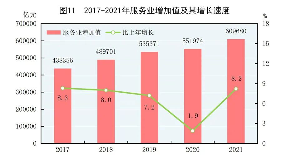 全年批發(fā)和零售業(yè)增加值110493億元,比上年增長11.3%;交通運輸、倉儲和郵政業(yè)增加值47061億元,增長12.1%;住宿和餐飲業(yè)增加值17853億元,增長14.5%;金融業(yè)增加值91206億元,增長4.8%;房地產(chǎn)業(yè)增加值77561億元,增長5.2%;信息傳輸、軟件和信息技術(shù)服務業(yè)增加值43956億元,增長17.2%;租賃和商務服務業(yè)增加值35350億元,增長6.2%。全年規(guī)模以上服務業(yè)企業(yè)營業(yè)收入比上年增長18.7%,利潤總額增長13.4%。