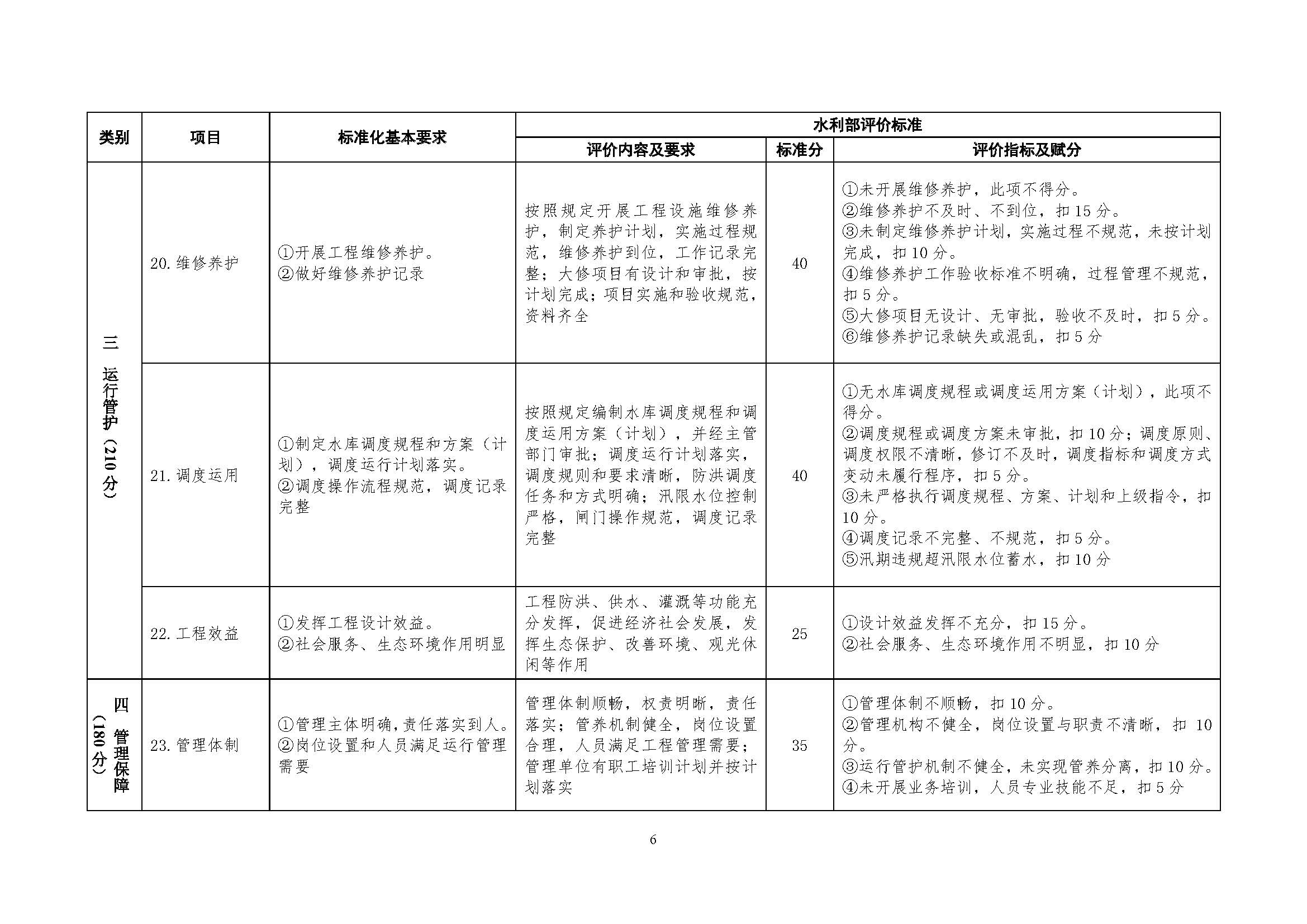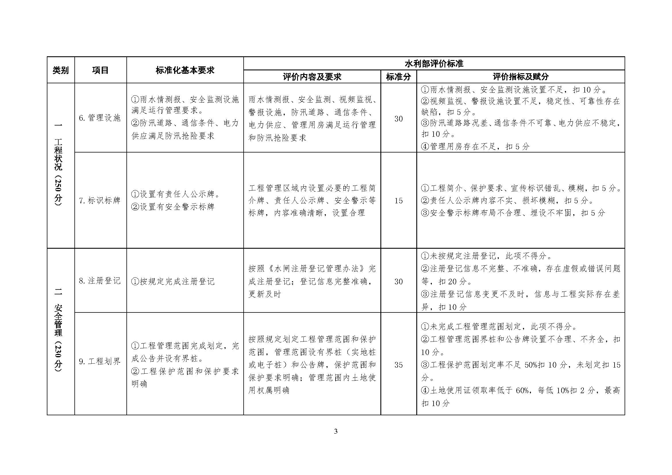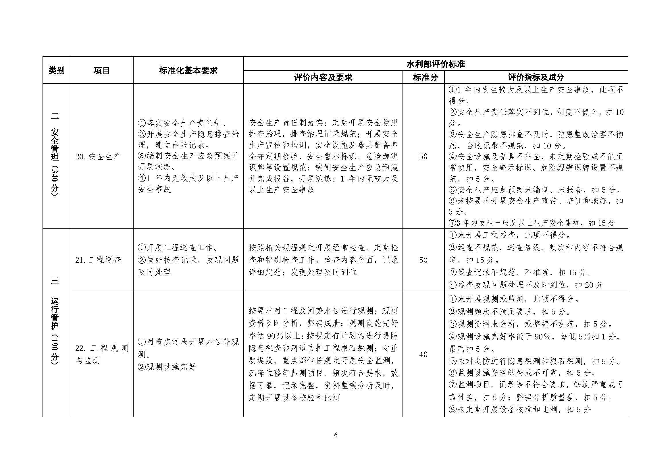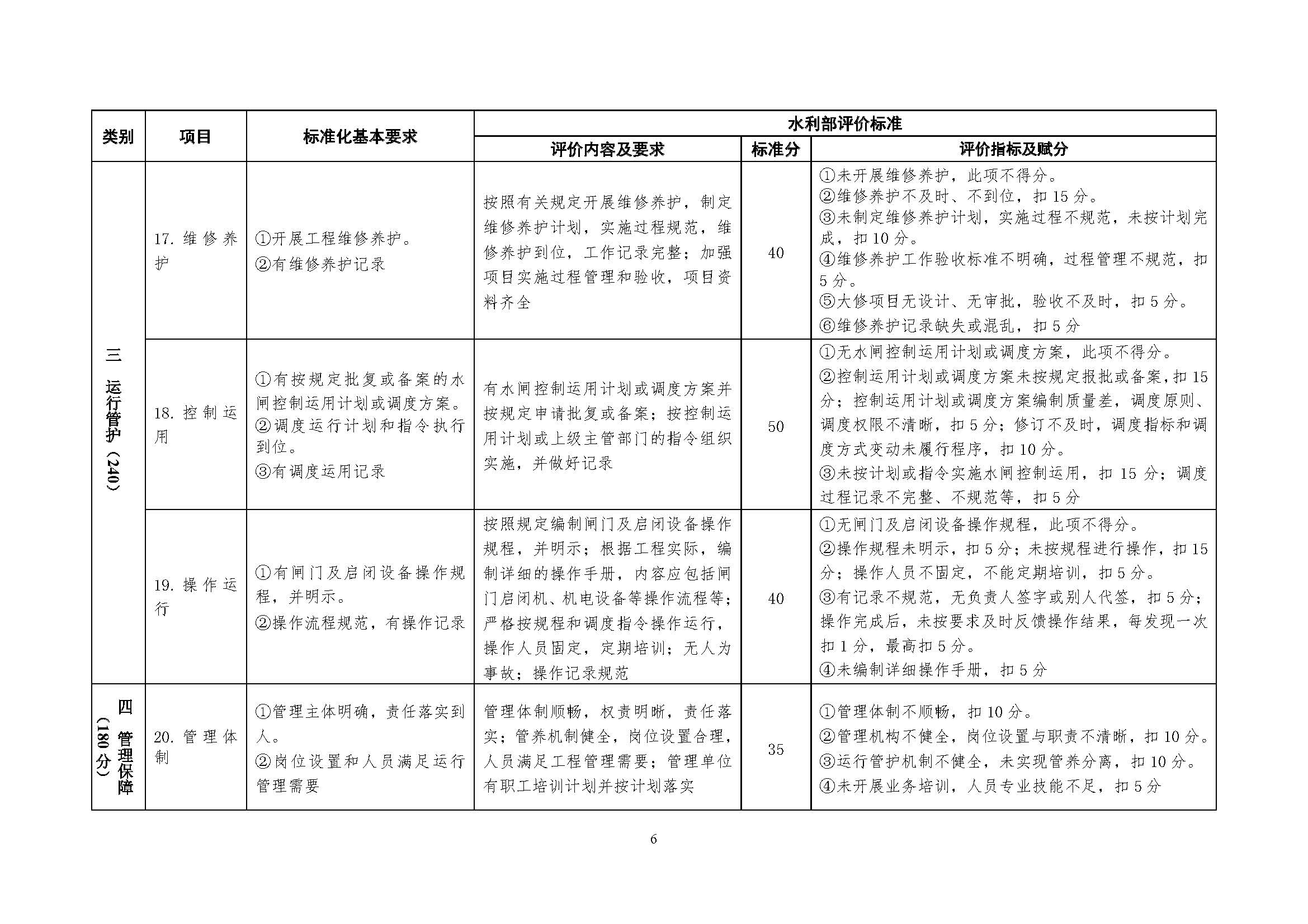 與《指導(dǎo)意見》相配套,同時(shí)印發(fā)了《評價(jià)辦法》及其評價(jià)標(biāo)準(zhǔn),對標(biāo)準(zhǔn)化評價(jià)的適用范圍、評價(jià)主體、評價(jià)程序等作出規(guī)定,包括大中型水庫、大中型水閘、3級以上堤防評價(jià)標(biāo)準(zhǔn)。