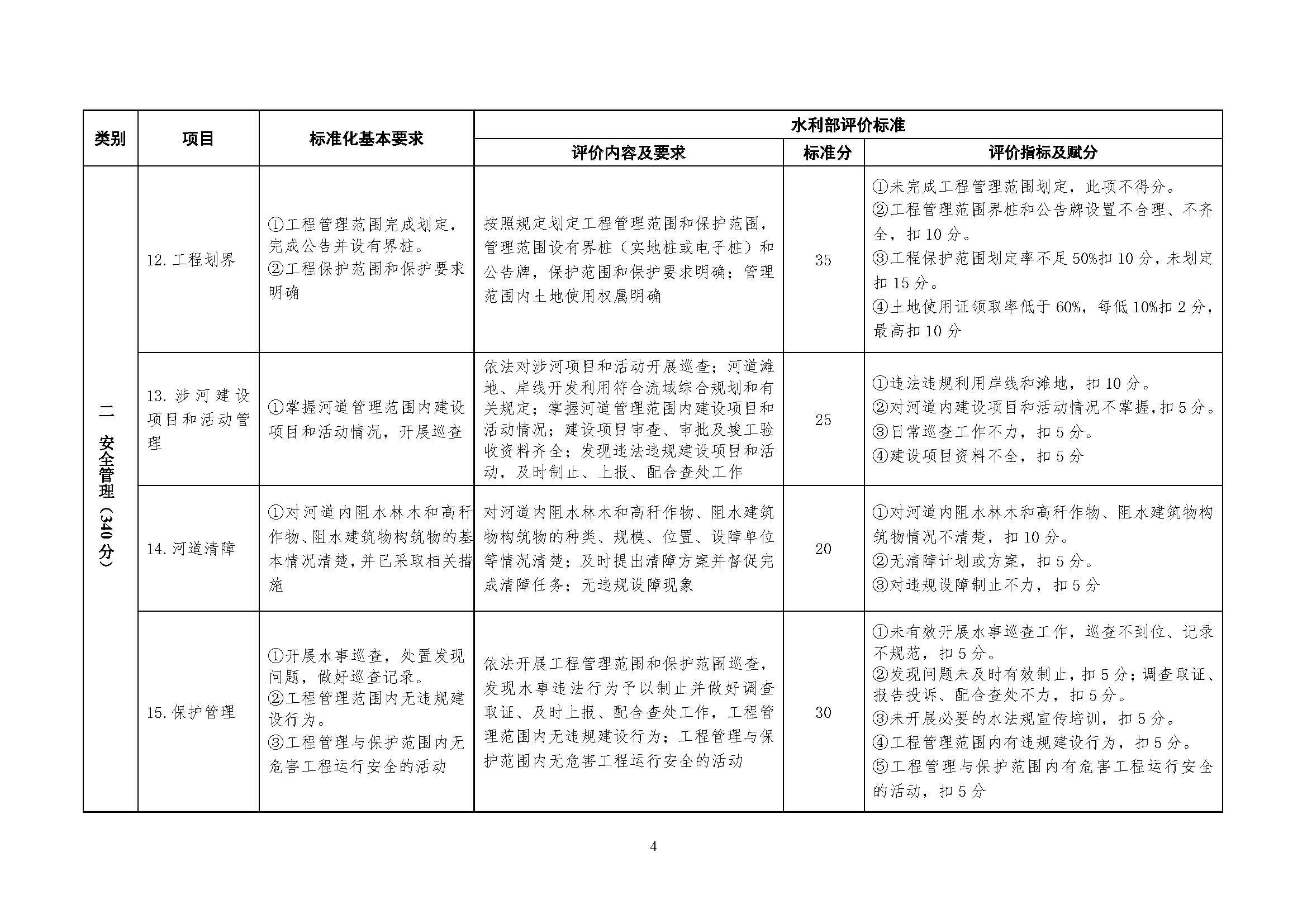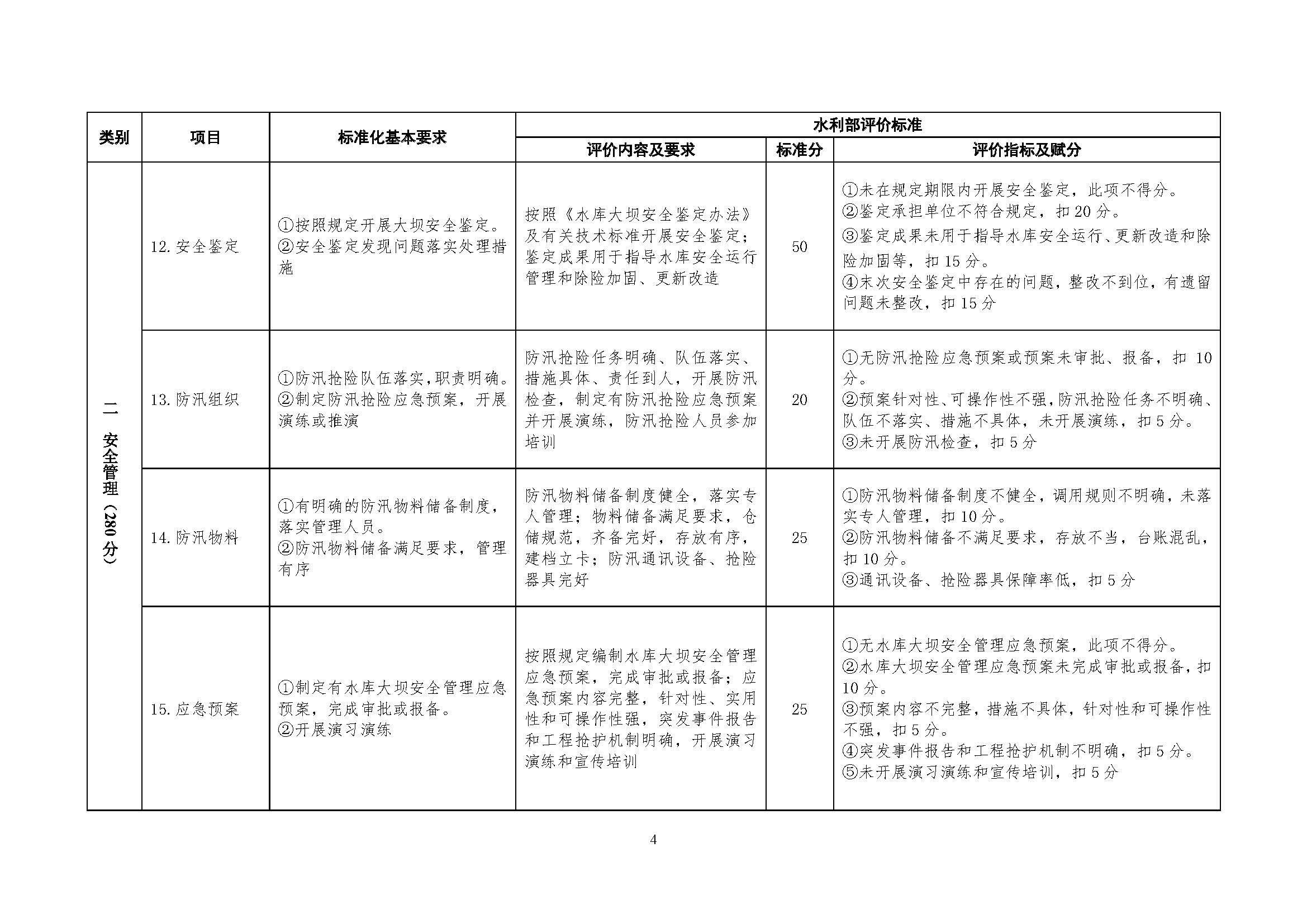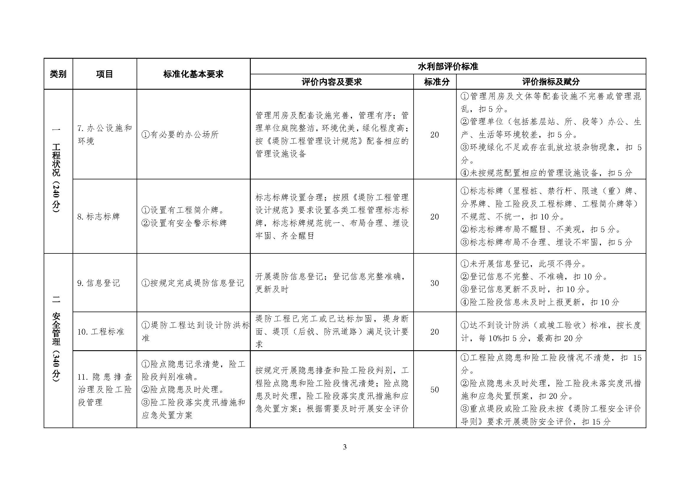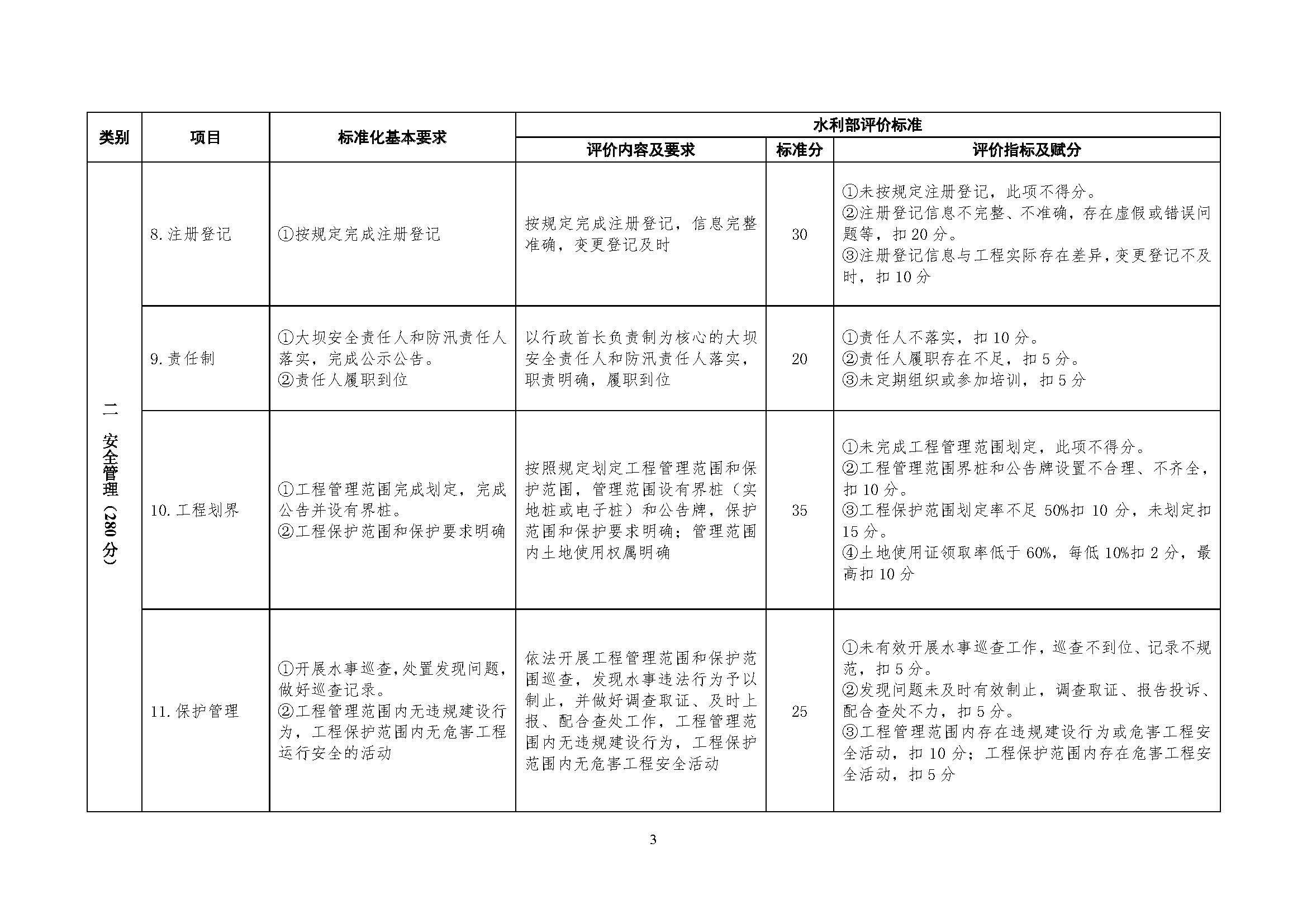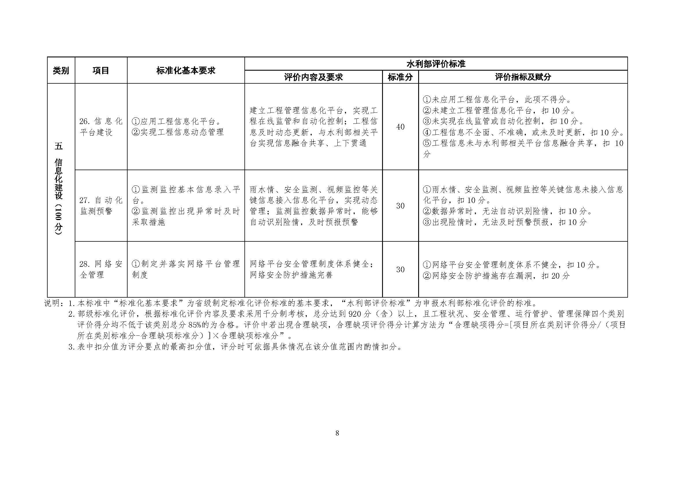 與《指導(dǎo)意見》相配套,同時(shí)印發(fā)了《評價(jià)辦法》及其評價(jià)標(biāo)準(zhǔn),對標(biāo)準(zhǔn)化評價(jià)的適用范圍、評價(jià)主體、評價(jià)程序等作出規(guī)定,包括大中型水庫、大中型水閘、3級以上堤防評價(jià)標(biāo)準(zhǔn)。