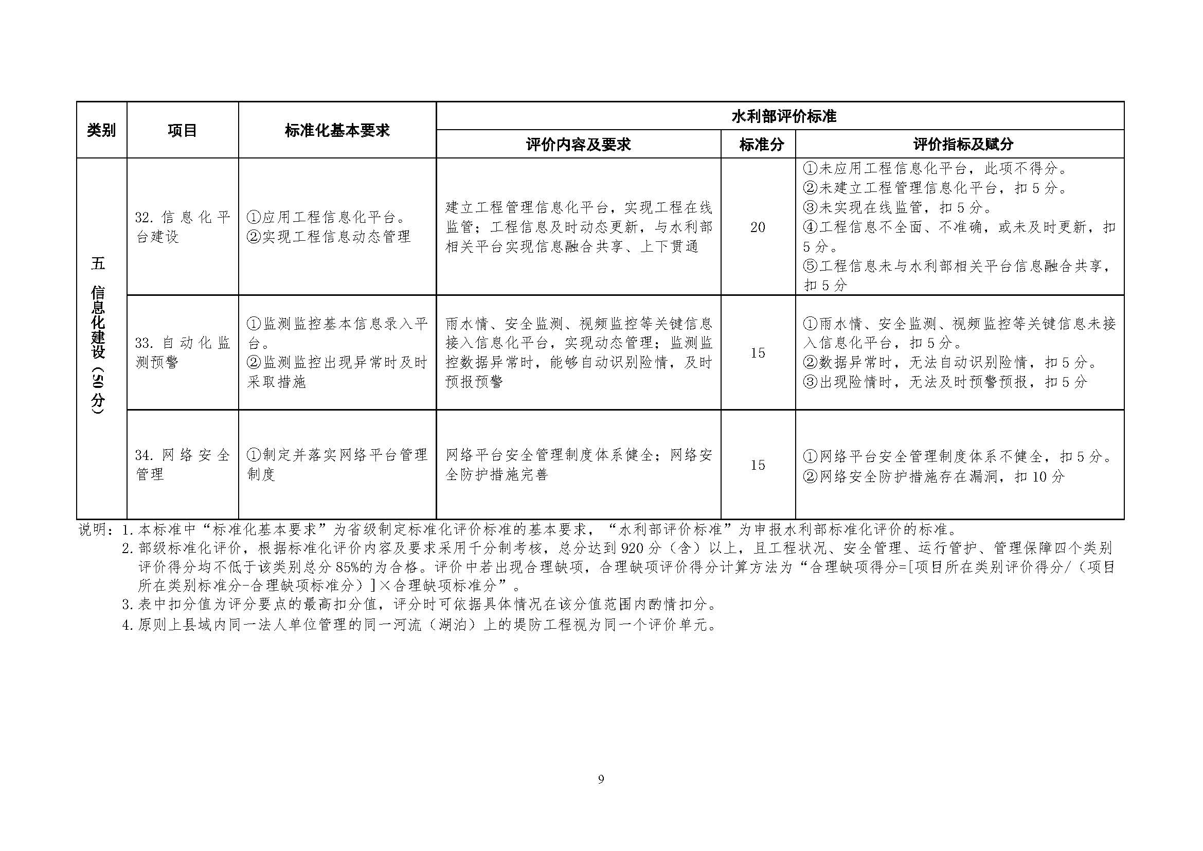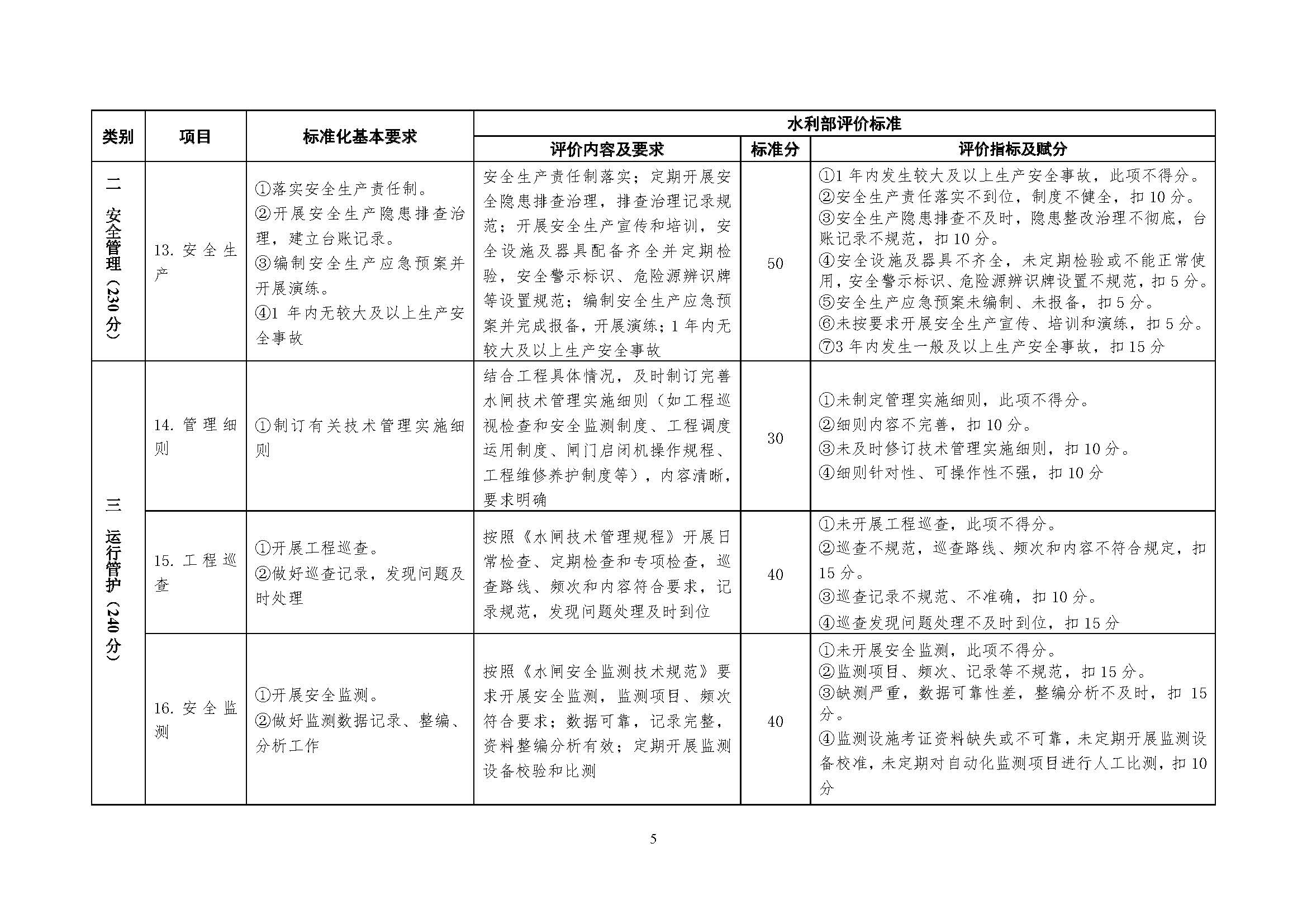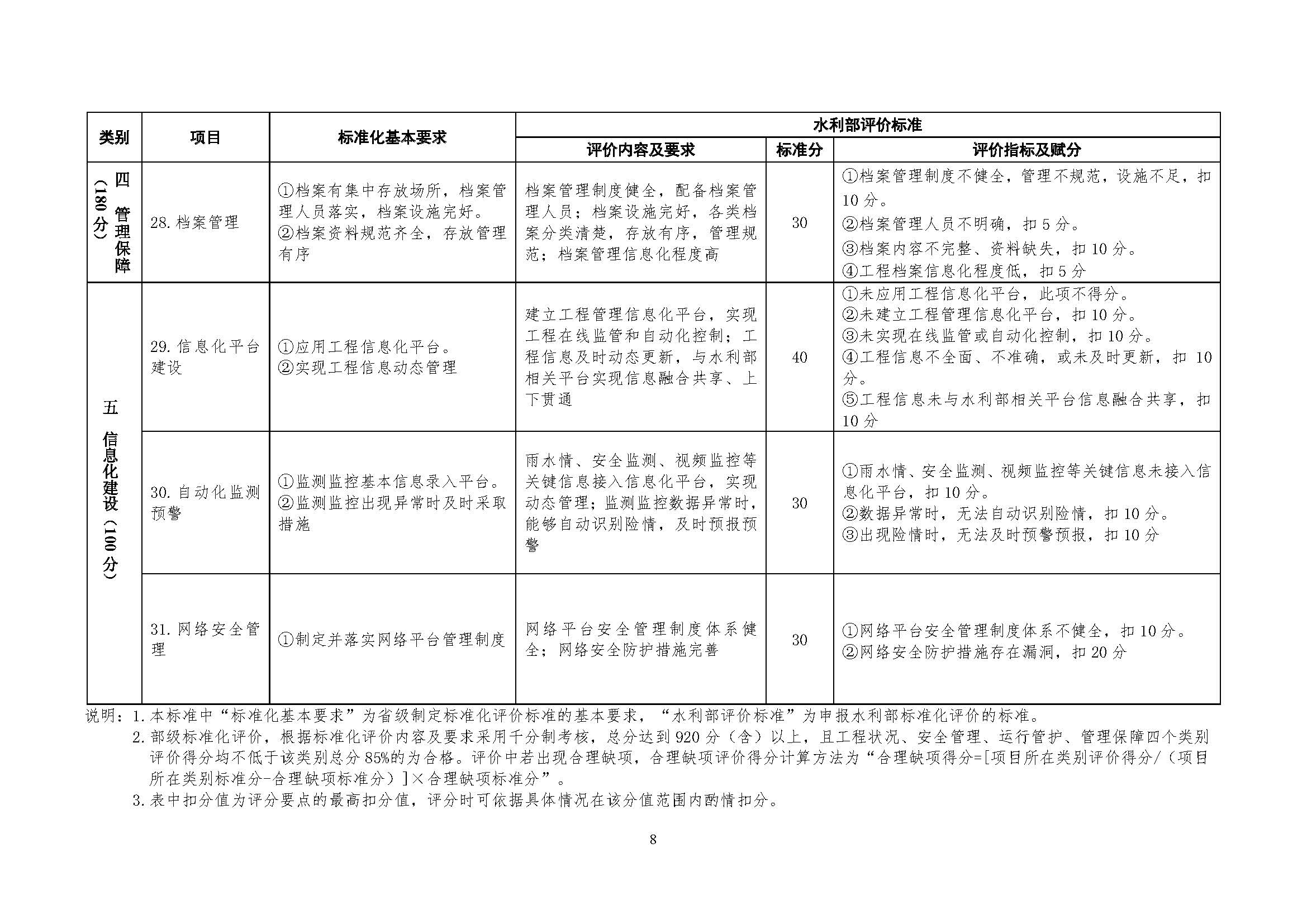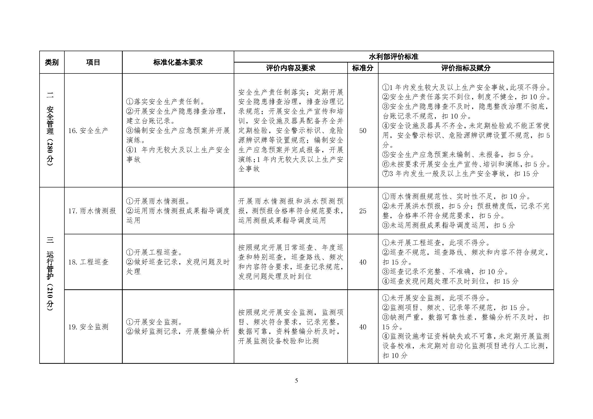 與《指導(dǎo)意見》相配套,同時(shí)印發(fā)了《評價(jià)辦法》及其評價(jià)標(biāo)準(zhǔn),對標(biāo)準(zhǔn)化評價(jià)的適用范圍、評價(jià)主體、評價(jià)程序等作出規(guī)定,包括大中型水庫、大中型水閘、3級以上堤防評價(jià)標(biāo)準(zhǔn)。