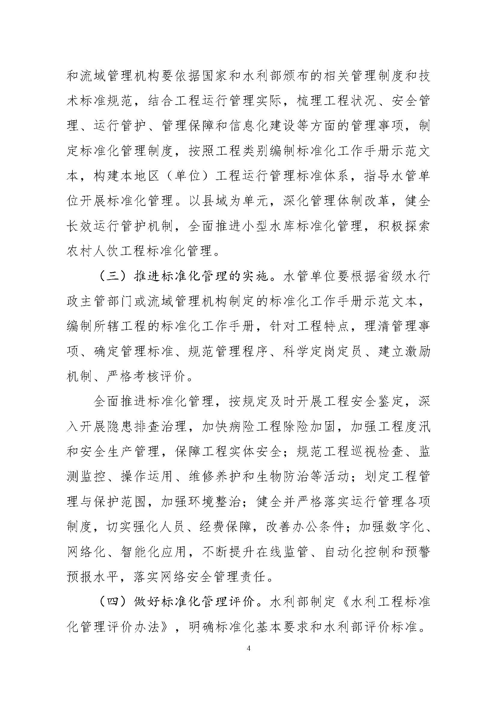 《指導(dǎo)意見》強(qiáng)調(diào),要落實(shí)管理責(zé)任,規(guī)范管理行為,提高管理能力,在工程狀況、安全管理、運(yùn)行管護(hù)、管理保障和信息化建設(shè)等5個(gè)方面滿足標(biāo)準(zhǔn)化管理要求。《指導(dǎo)意見》還確定了制定實(shí)施方案、建立運(yùn)行管理標(biāo)準(zhǔn)體系、推進(jìn)標(biāo)準(zhǔn)化管理的實(shí)施、做好標(biāo)準(zhǔn)化管理評價(jià)等工作步驟和具體內(nèi)容,提出了保障措施。
