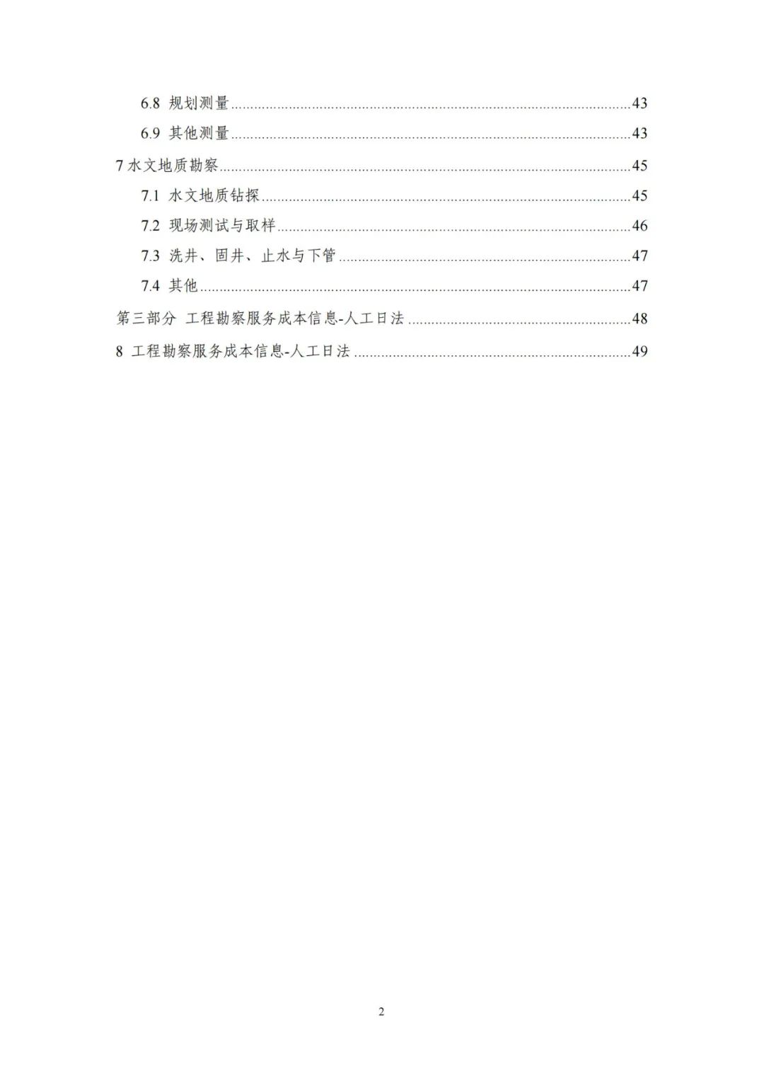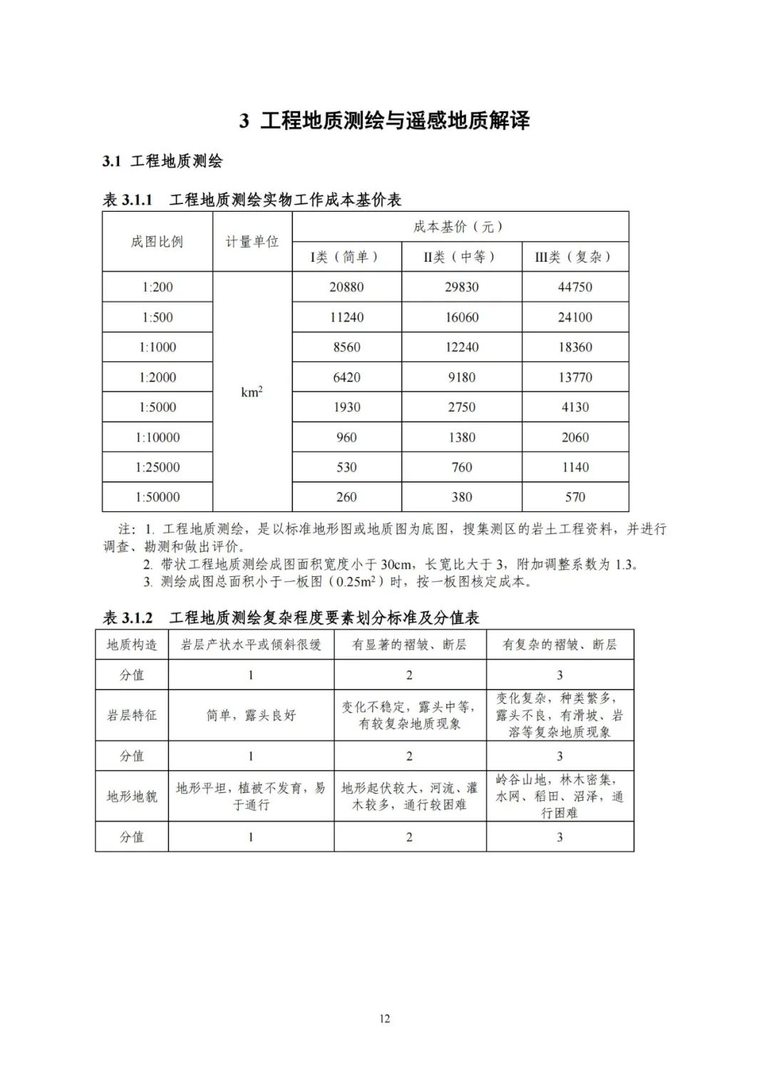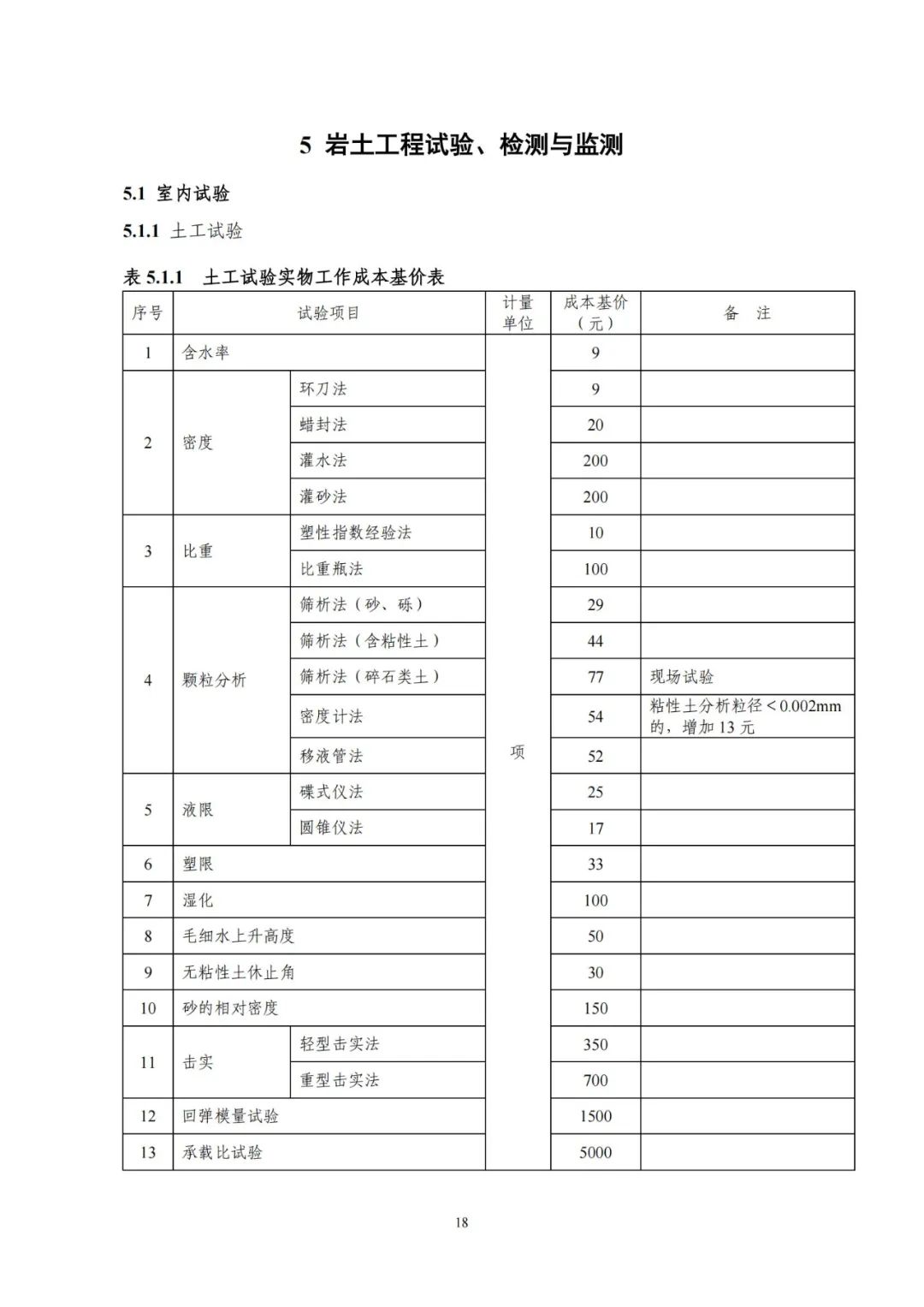 《要素信息》分為八章,相關成本測算分為工程費法(其包含巖土工程勘察、巖土工程勘察咨詢與監理、巖土工程設計和專業工程咨詢)、實物工作量法(其包含工程地質測繪與遙感地質解譯、巖土工程勘探與取樣、巖土工程試驗/檢測與監測、工程測量、水文地質勘察)及人工日法三類。除傳統的巖土工程試驗、測試和工程測量項目外,實物工作成本包括了土的易溶鹽及導熱系數等室內試驗、多功能數字式孔壓靜力觸探試驗、溫度測量等工程物探、海洋和內陸水域測量、無人機航空攝影測量、地面三維激光掃描測量、規劃測量等以新技術方法為主的專業技術服務項目。